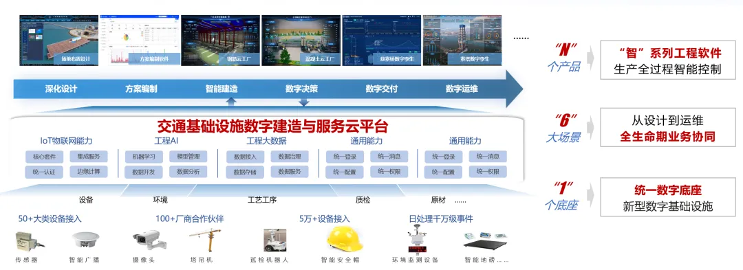 一是创新打造“1+6+N”数字建造一体化服务体系。针对传统建造各环节数据割裂、管理碎片化等问题,采用数算分离、模块解耦设计等技术,建设交通基础设施数字建造与服务平台,覆盖深化设计、方案编制、虚拟建造、智能建造、数字决策、数字运维等6大业务场景,集成施工信息模型管理、混凝土云工厂等N个系统,实现交通基础设施数字建造全生命周期服务与全流程协同管控。